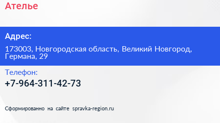 Ателье по адресу 173003, Новгородская область, Великий Новгород, Германа, 29 в дальнейшем Организация, размещена в следующих категориях: