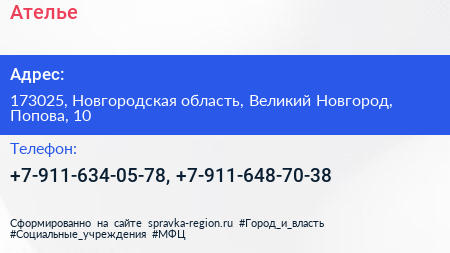 Ателье по адресу 173025, Новгородская область, Великий Новгород, Попова, 10 в дальнейшем Организация, размещена в следующих категориях: