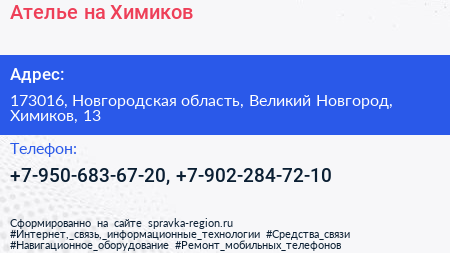 Ателье на Химиков по адресу 173016, Новгородская область, Великий Новгород, Химиков, 13 в дальнейшем Организация, размещена в следующих категориях: