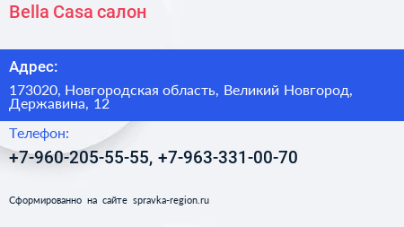 Bella Casa, салон по адресу 173020, Новгородская область, Великий Новгород, Державина, 12 в дальнейшем Организация, размещена в следующих категориях: