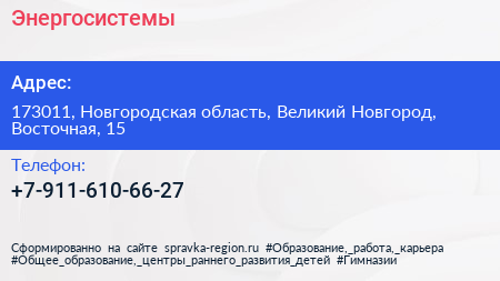Энергосистемы по адресу 173011, Новгородская область, Великий Новгород, Восточная, 15 в дальнейшем Организация, размещена в следующих категориях: