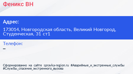 Феникс-ВН по адресу 173014, Новгородская область, Великий Новгород, Студенческая, 31 ст1 в дальнейшем Организация, размещена в следующих категориях:
