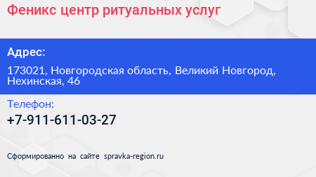 Феникс, центр ритуальных услуг по адресу 173021, Новгородская область, Великий Новгород, Нехинская, 46 в дальнейшем Организация, размещена в следующих категориях: