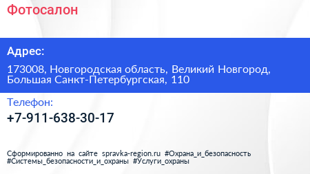 Фотосалон по адресу 173008, Новгородская область, Великий Новгород, Большая Санкт-Петербургская, 110 в дальнейшем Организация, размещена в следующих категориях: