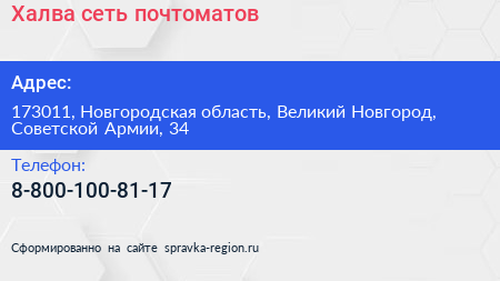 Халва, сеть почтоматов по адресу 173011, Новгородская область, Великий Новгород, Советской Армии, 34 в дальнейшем Организация, размещена в следующих категориях: