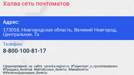 Халва, сеть почтоматов по адресу 173018, Новгородская область, Великий Новгород, Центральная, 7а в дальнейшем Организация, размещена в следующих категориях: