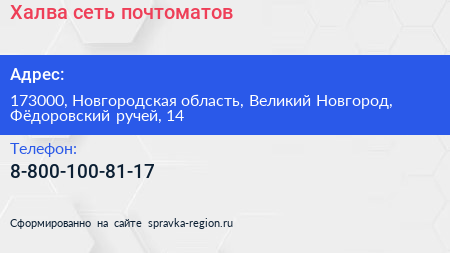 Халва, сеть почтоматов по адресу 173000, Новгородская область, Великий Новгород, Фёдоровский ручей, 14 в дальнейшем Организация, размещена в следующих категориях: