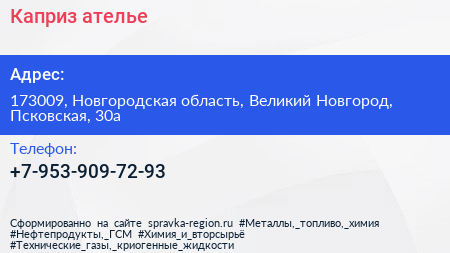 Каприз, ателье по адресу 173009, Новгородская область, Великий Новгород, Псковская, 30а в дальнейшем Организация, размещена в следующих категориях: