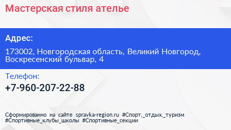 Мастерская стиля, ателье по адресу 173002, Новгородская область, Великий Новгород, Воскресенский бульвар, 4 в дальнейшем Организация, размещена в следующих категориях: