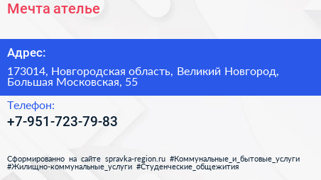 Мечта, ателье по адресу 173014, Новгородская область, Великий Новгород, Большая Московская, 55 в дальнейшем Организация, размещена в следующих категориях:
