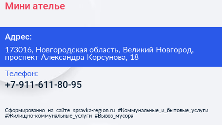 Мини-ателье по адресу 173016, Новгородская область, Великий Новгород, проспект Александра Корсунова, 18 в дальнейшем Организация, размещена в следующих категориях: