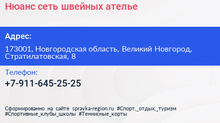 Нюанс, сеть швейных ателье по адресу 173001, Новгородская область, Великий Новгород, Стратилатовская, 8 в дальнейшем Организация, размещена в следующих категориях: