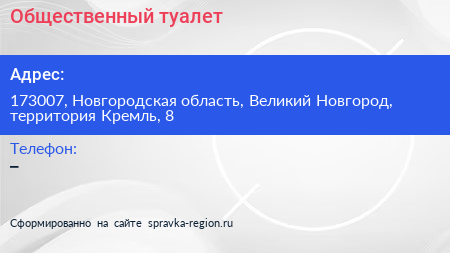 Общественный туалет по адресу 173007, Новгородская область, Великий Новгород, территория Кремль, 8 в дальнейшем Организация, размещена в следующих категориях: