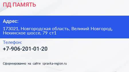 ПД ПАМЯТЬ по адресу 173021, Новгородская область, Великий Новгород, Нехинское шоссе, 79 ст1 в дальнейшем Организация, размещена в следующих категориях: