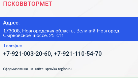 ПСКОВВТОРМЕТ по адресу 173008, Новгородская область, Великий Новгород, Сырковское шоссе, 25 ст1 в дальнейшем Организация, размещена в следующих категориях: