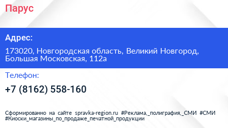 Парус по адресу 173020, Новгородская область, Великий Новгород, Большая Московская, 112а в дальнейшем Организация, размещена в следующих категориях: