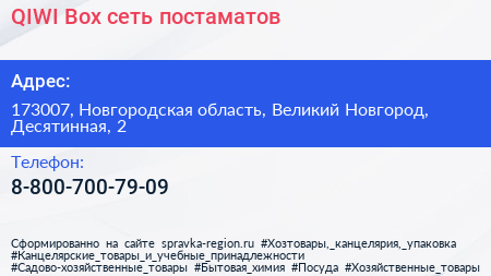 QIWI Box, сеть постаматов по адресу 173007, Новгородская область, Великий Новгород, Десятинная, 2 в дальнейшем Организация, размещена в следующих категориях: