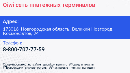 Qiwi, сеть платежных терминалов по адресу 173016, Новгородская область, Великий Новгород, Космонавтов, 24 в дальнейшем Организация, размещена в следующих категориях:
