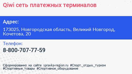 Qiwi, сеть платежных терминалов по адресу 173025, Новгородская область, Великий Новгород, Кочетова, 20 в дальнейшем Организация, размещена в следующих категориях: