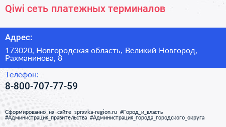 Qiwi, сеть платежных терминалов по адресу 173020, Новгородская область, Великий Новгород, Рахманинова, 8 в дальнейшем Организация, размещена в следующих категориях:
