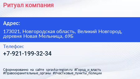 Ритуал, компания по адресу 173021, Новгородская область, Великий Новгород, деревня Новая Мельница, 69Б в дальнейшем Организация, размещена в следующих категориях: