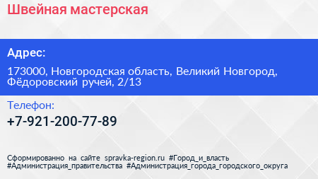 Швейная мастерская по адресу 173000, Новгородская область, Великий Новгород, Фёдоровский ручей, 2/13 в дальнейшем Организация, размещена в следующих категориях: