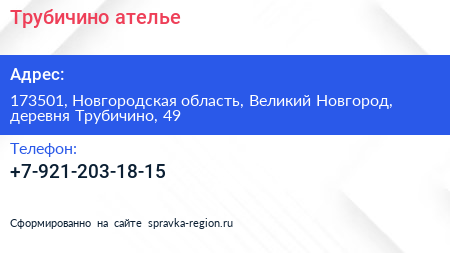 Трубичино, ателье по адресу 173501, Новгородская область, Великий Новгород, деревня Трубичино, 49 в дальнейшем Организация, размещена в следующих категориях: