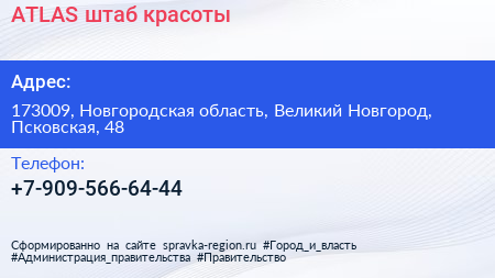 ATLAS, штаб красоты по адресу 173009, Новгородская область, Великий Новгород, Псковская, 48 в дальнейшем Организация, размещена в следующих категориях: