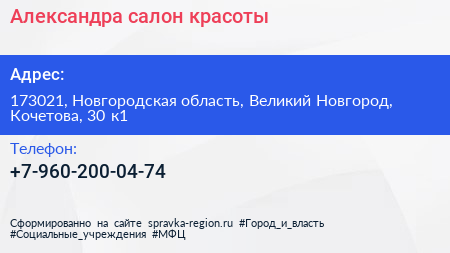 Александра, салон красоты по адресу 173021, Новгородская область, Великий Новгород, Кочетова, 30 к1 в дальнейшем Организация, размещена в следующих категориях: