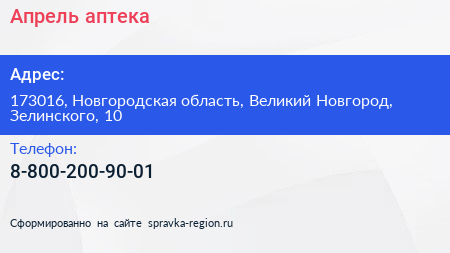 Апрель, аптека по адресу 173016, Новгородская область, Великий Новгород, Зелинского, 10 в дальнейшем Организация, размещена в следующих категориях: