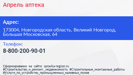 Апрель, аптека по адресу 173004, Новгородская область, Великий Новгород, Большая Московская, 64 в дальнейшем Организация, размещена в следующих категориях:
