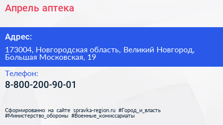 Апрель, аптека по адресу 173004, Новгородская область, Великий Новгород, Большая Московская, 19 в дальнейшем Организация, размещена в следующих категориях: