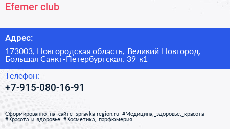 Efemer club по адресу 173003, Новгородская область, Великий Новгород, Большая Санкт-Петербургская, 39 к1 в дальнейшем Организация, размещена в следующих категориях: