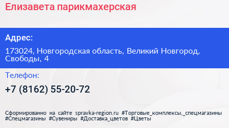 Елизавета, парикмахерская по адресу 173024, Новгородская область, Великий Новгород, Свободы, 4 в дальнейшем Организация, размещена в следующих категориях: