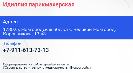 Идиллия, парикмахерская по адресу 173025, Новгородская область, Великий Новгород, Коровникова, 13 к3 в дальнейшем Организация, размещена в следующих категориях: