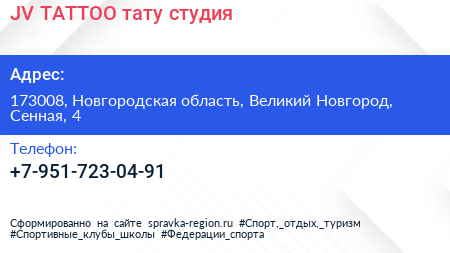 JV TATTOO, тату-студия по адресу 173008, Новгородская область, Великий Новгород, Сенная, 4 в дальнейшем Организация, размещена в следующих категориях: