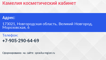 Камелия, косметический кабинет по адресу 173021, Новгородская область, Великий Новгород, Морозовская, 6 в дальнейшем Организация, размещена в следующих категориях: