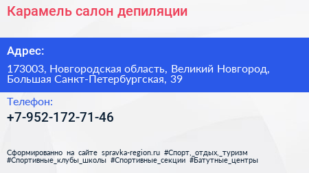 Карамель, салон депиляции по адресу 173003, Новгородская область, Великий Новгород, Большая Санкт-Петербургская, 39 в дальнейшем Организация, размещена в следующих категориях: