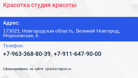 Красотка, студия красоты по адресу 173021, Новгородская область, Великий Новгород, Морозовская, 6 в дальнейшем Организация, размещена в следующих категориях: