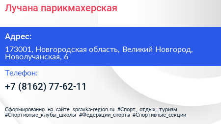 Лучана, парикмахерская по адресу 173001, Новгородская область, Великий Новгород, Новолучанская, 6 в дальнейшем Организация, размещена в следующих категориях: