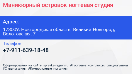 Маникюрный островок, ногтевая студия по адресу 173009, Новгородская область, Великий Новгород, Волотовская, 7 в дальнейшем Организация, размещена в следующих категориях: