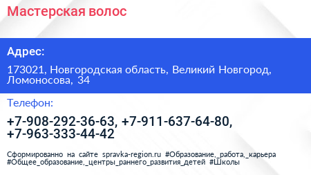 Мастерская волос по адресу 173021, Новгородская область, Великий Новгород, Ломоносова, 34 в дальнейшем Организация, размещена в следующих категориях: