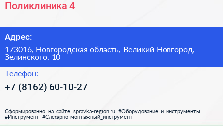 Поликлиника №4 по адресу 173016, Новгородская область, Великий Новгород, Зелинского, 10 в дальнейшем Организация, размещена в следующих категориях: