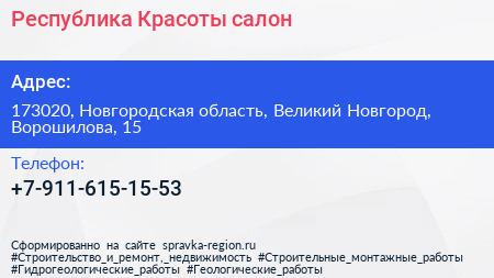 Республика Красоты, салон по адресу 173020, Новгородская область, Великий Новгород, Ворошилова, 15 в дальнейшем Организация, размещена в следующих категориях: