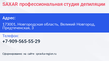 SAXAR, профессиональная студия депиляции по адресу 173001, Новгородская область, Великий Новгород, Предтеченская, 3 в дальнейшем Организация, размещена в следующих категориях: