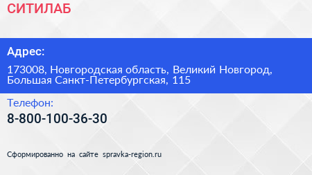 СИТИЛАБ по адресу 173008, Новгородская область, Великий Новгород, Большая Санкт-Петербургская, 115 в дальнейшем Организация, размещена в следующих категориях: