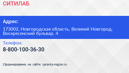 СИТИЛАБ по адресу 173002, Новгородская область, Великий Новгород, Воскресенский бульвар, 4 в дальнейшем Организация, размещена в следующих категориях: