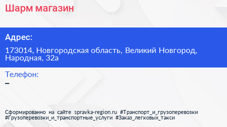 Шарм, магазин по адресу 173014, Новгородская область, Великий Новгород, Народная, 32а в дальнейшем Организация, размещена в следующих категориях: