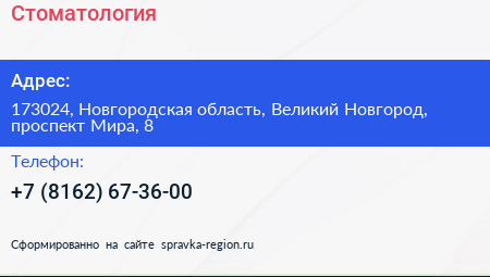Стоматология по адресу 173024, Новгородская область, Великий Новгород, проспект Мира, 8 в дальнейшем Организация, размещена в следующих категориях: