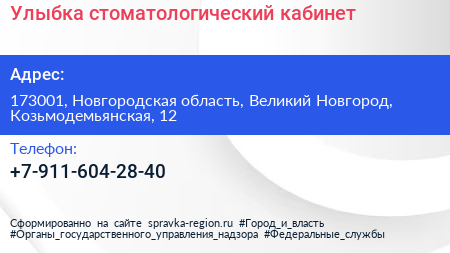 Улыбка, стоматологический кабинет по адресу 173001, Новгородская область, Великий Новгород, Козьмодемьянская, 12 в дальнейшем Организация, размещена в следующих категориях: